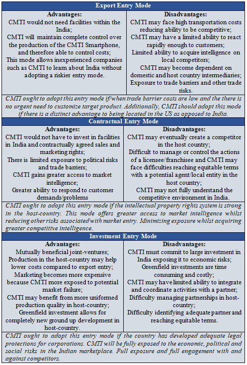 Based on CMTI’s lack of experience as an international business and the social, economic, and political risks it will face when entering India, this report advises a more cautious approach to market entry in India. As such, CMTI should consider entering the host country via the export entry mode confining the company’s risk exposure to the exportation of the CMTI Smartphone into the country. Additionally, CMTI ought to take a direct approach to exporting its product and acquire a target country agent to help locate host-country buyers, develop transportation arrangements and invest in a robust marketing plan in India.[xxviii]